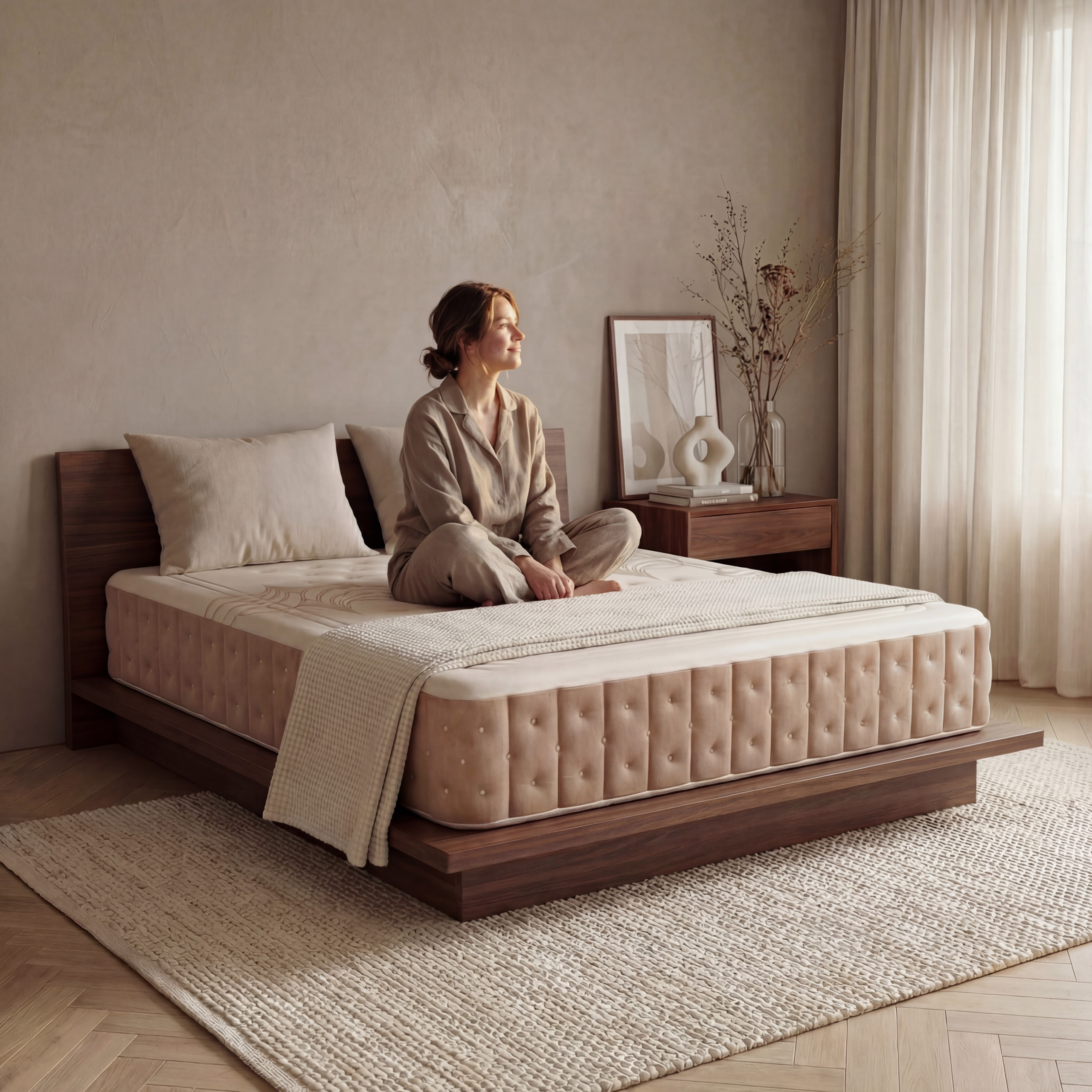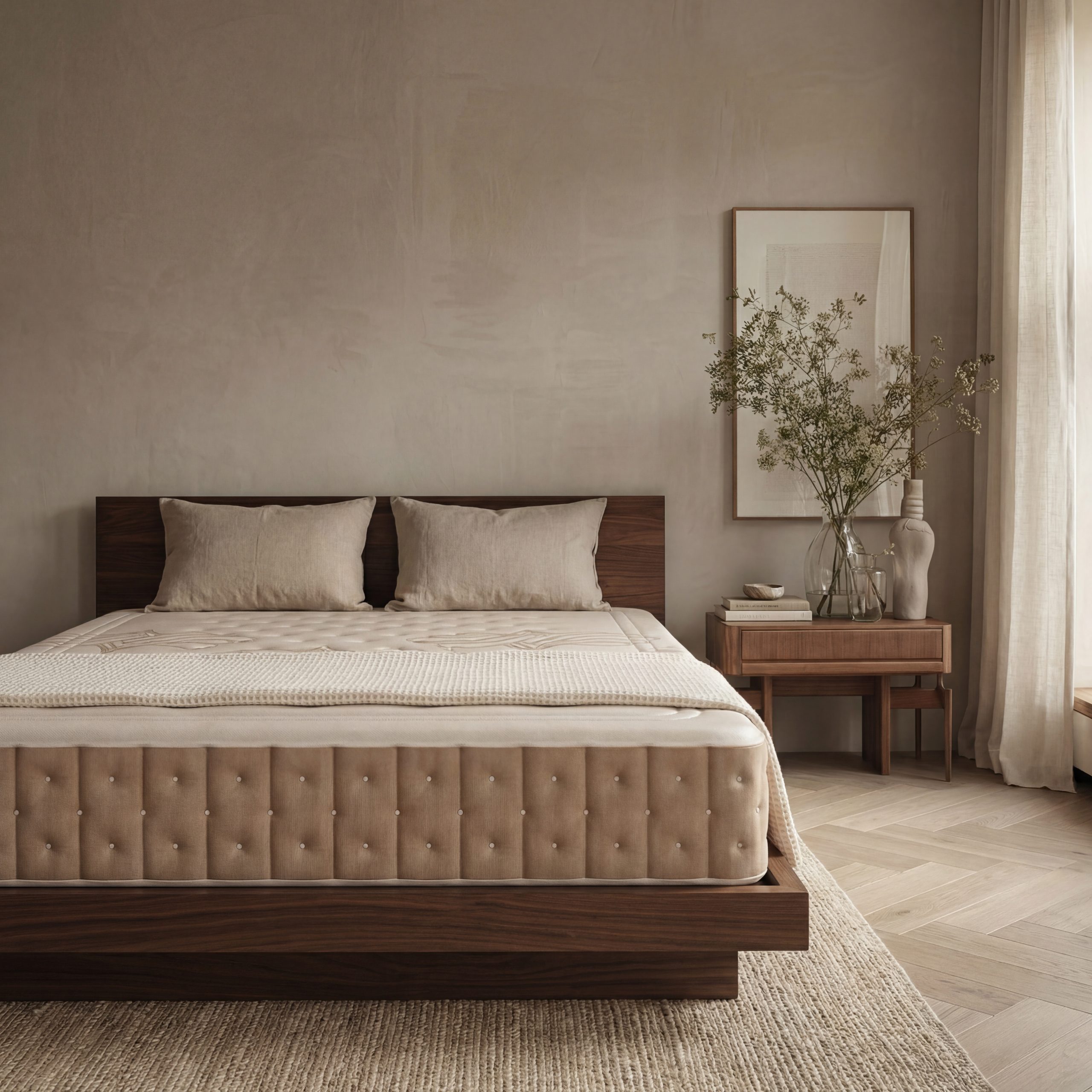 El látex natural proporciona soporte firme y transpirable, mientras que la visco vegetal de soja aporta la ergonomía perfecta, moldeándose naturalmente a tus contornos sin químicos sintéticos. Esta combinación orgánica crea un descanso saludable, libre de formaldehídos, VOCs y otros tóxicos que pueden irritar tu piel.